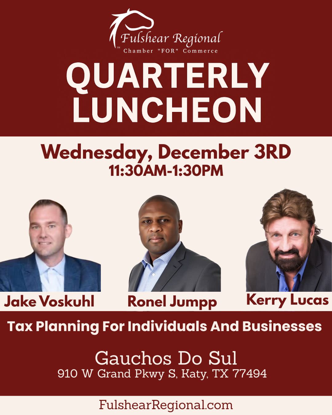 The Fulshear Regional Chamber FOR Commerce invites you to our Quarterly Luncheon on Wednesday, December 3rd, from 11:30 AM – 1:30 PM at Gauchos Do Sul, located at 910 W Grand Pkwy S, Katy, TX 77494.