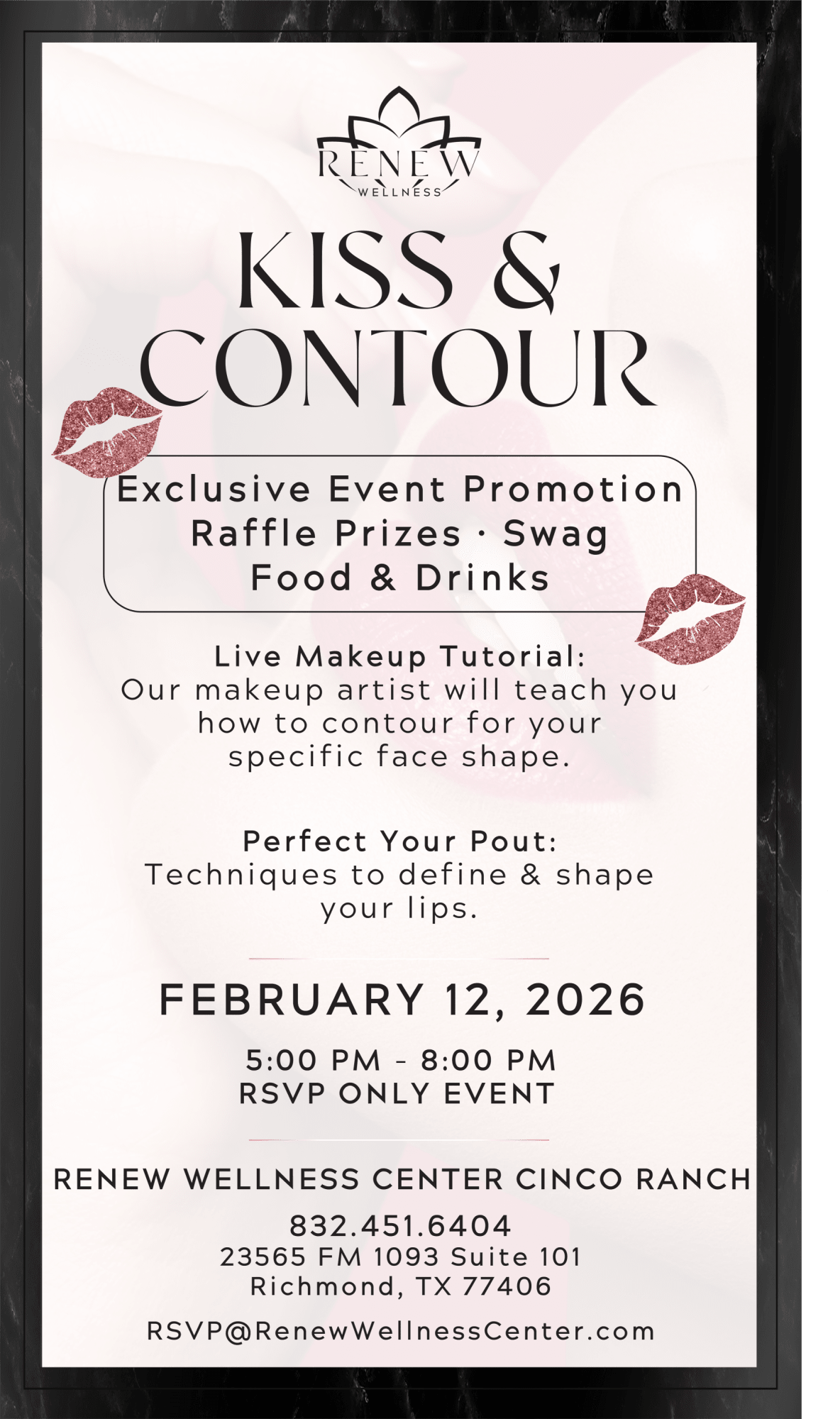 Join us at Renew Wellness Center for our Galentine's event and learn how to enhance your natural features with and without makeup! Our expert makeup artists will partner with our advanced providers to help you achieve beautifully balanced results with minimal time and effort. Grab your girls and join us for a night of GLAM! Bring a friend, RSVP, enjoy raffle prizes, exclusive promotions, and plenty of fun at Renew Wellness!