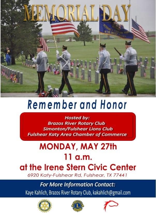 The Brazos River Rotary Club, the Fulshear-Simonton Lions Club, and the Fulshear Katy Area Chamber of Commerce are hosting a Memorial Day Ceremony on Monday, May 27, 2024 at the Irene Stern Community Center. The public is invited. Please join us as we remember and honor those that made the greatest sacrifice to preserve and protect our Constitution and liberty.